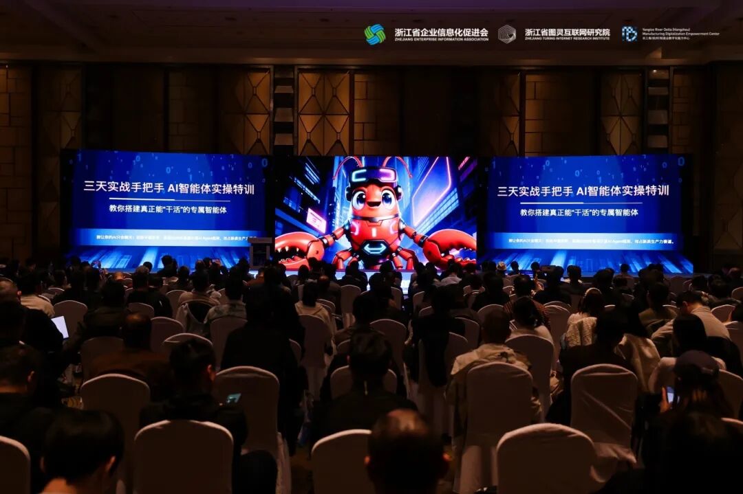 大会现场,浙江省企业信息化促进会正式发布龙虾实战训练营。训练营将会通过三天的集中实操教学,手把手带领学员从零搭建真正能够投入业务的智能体。训练营将于四月下旬正式开课,为有意布局智能体应用的企业及个人提供系统化的入门通道。