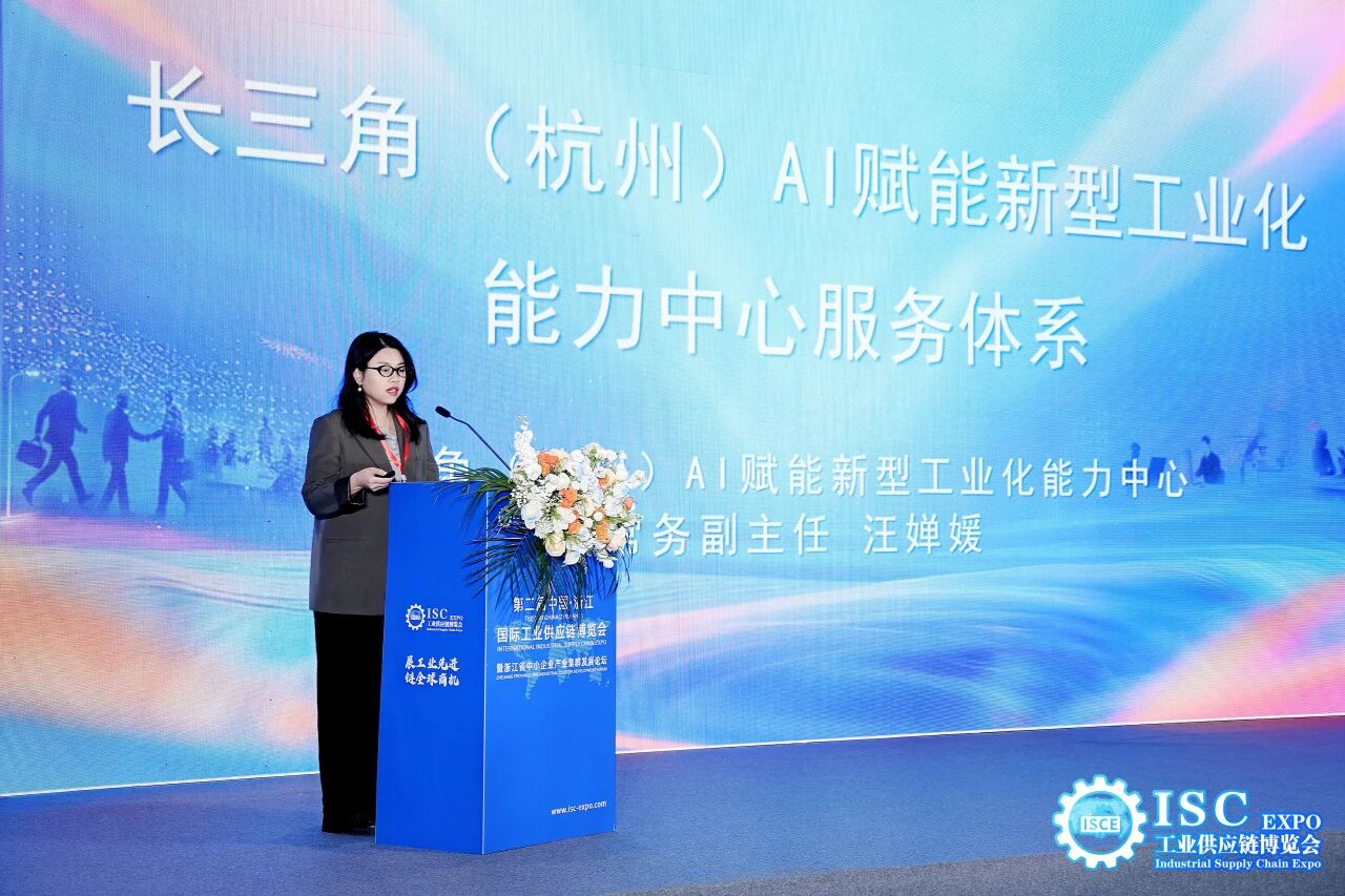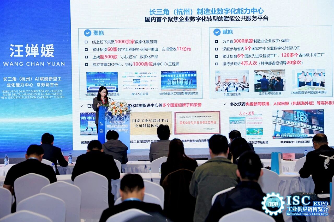 长三角(杭州)制造业数字化能力中心常务副主任汪婵媛受邀出席AI人工智能与工业供应链互联会,从产业变革、政策机遇、能力中心服务体系与成果三个维度作交流分享。